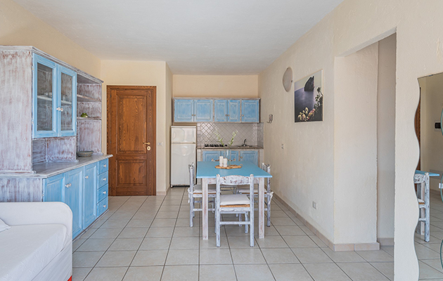(50/60m2) composto da soggiorno con angolo cottura e divano letto doppio, una camera matrimoniale, una camera con 2 letti singoli o letto a castello, un bagno con doccia. Possibilità di aggiungere una culla con supplemento.