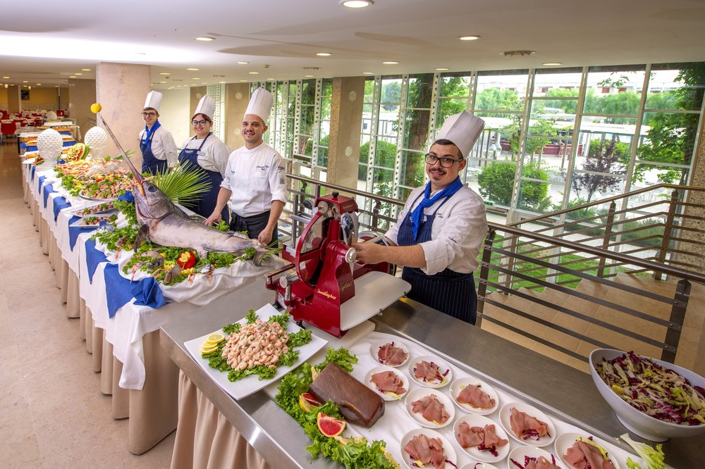 Pasti a buffet e show cooking. Sistemazione in tavoli singoli per nucleo familiare o in una delle sale climatizzate del ristorante centrale o presso il patio, zona esterna ombreggiata,  su prenotazione. Disponibili prodotti base per celiaci, confezionati, privi di glutine e piatti senza glutine, lattosio e uova al buffet (non garantita assenza di contaminazione). Dal 7/6 all'11/9 ristorante al mare Scirò, aperto a pranzo, pizzeria Ethra (presso l'adiacente Valentino) e grill, aperta a cena, entrambi con servizio a buffet, con tavoli riservati, aperti a disponibilità limitata con turni a fasce orarie prenotabili il giorno precedente (escluso domenica). Più: la Pensione Completa Bluserena con 1° colazione a buffet con caffetteria non espressa, pranzo e cena a buffet e show-cooking, vino alla spina ed acqua microfiltrata, pranzo riservato per mini, teeny e junior club (7/6-11/9), spuntini in spiaggia (ad orari stabiliti), 1 accesso massimo a persona c/o il ristorante Scirò e la pizzeria Ethra. Possibilità di utilizzo cucina-baby-biberoneria, acqua, 1 ombrellone + 1 lettino + 1 sdraio a famiglia. Extra: l'All Inclusive Bluserena (prenotabile per soggiorni di minimo 7 notti e da pagare per tutti gli occupanti camera) comprende (oltre quanto previsto nella Pensione Più) caffetteria espressa a colazione, bibite alla spina da 20 cl a pasto a partire dai 3 anni a scelta, consumazioni illimitate al bar di caffetteria espressa, acqua minerale al bicchiere, birra alla spina 20 cl, granite, 1 vino bianco, 1 vino rosso, succhi, amari e liquori nazionali, grappe, 1 telo mare per persona dai 12 anni con cambio settimanale, 2 accessi massimo a persona per soggiorni di 7 notti c/o il ristorante Scirò e la pizzeria Ethra. Formula Jolly, comprende accesso illimitato presso il ristorante Scirò o la pizzeria Ethra, tavolo assegnato per l'intera durata del soggiorno. Cucina-baby-biberoneria: accessibile dalle 6.00 alle 00.00 con assistenza e disponibilità di prodotti base ai pasti principali, con tavoli, seggioloni. Ai pasti principali brodi vegetali e di carne, passato di verdure, pastine, fettine di carne, filetti di pesce, prosciutto cotto, latticini, frutta, latte fresco, di soia e di riso, yogurt, marmellatine, the e camomilla, biscotti (non disponibili omogeneizzati, formaggini e latte per la prima infanzia liquido o in polvere).