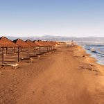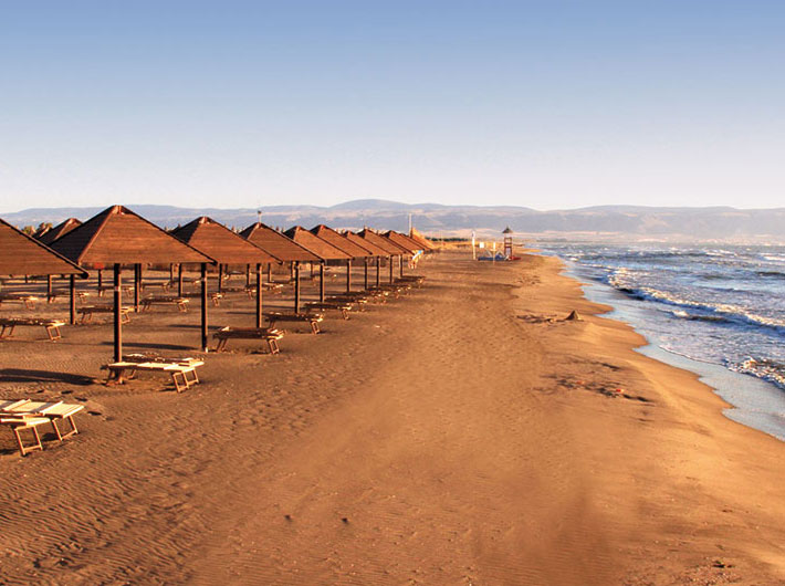 A 150 m, ampia, di sabbia fine, privata e attrezzata, con bar, docce e servizi, raggiungibile a piedi attraverso vialetto interno. Servizio spiaggia incluso nella Club Card a partire dalla 3° fila (1 ombrellone + 1 sdraio + 1 lettino a camera).