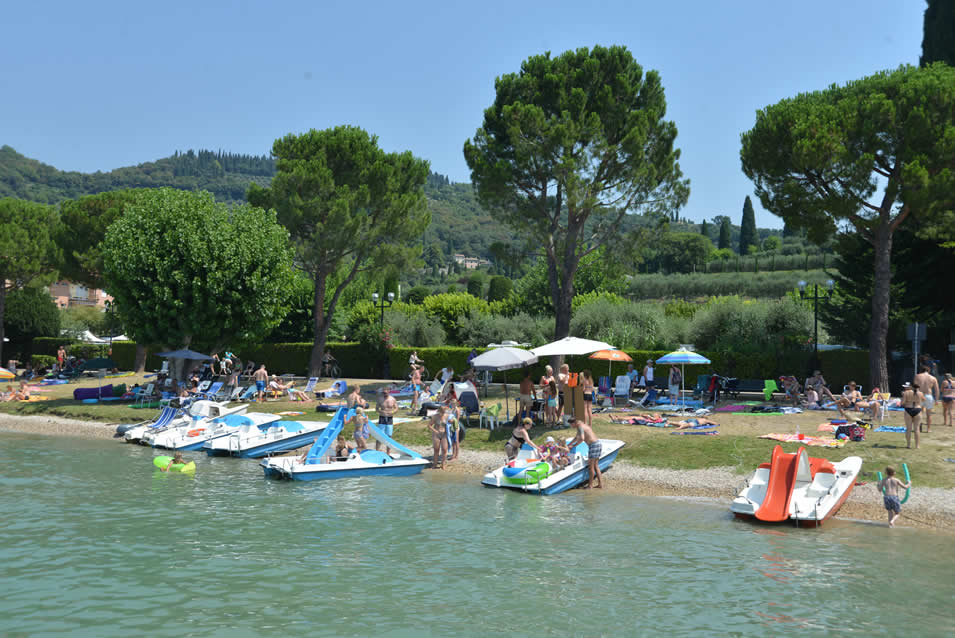 Spiaggia: spiaggia di erba e ciottoli, libera e con accesso dalla ciclopedonale che collega Garda e Bardolino