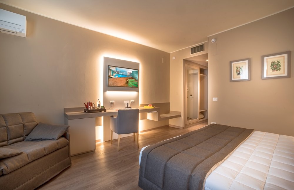 Camere ampie ed accoglienti, arredate con eleganza e impreziosite da tessuti pregiati che richiamano i colori delle pareti, dotate di tv, telefono, minibar, cassaforte, climatizzazione autonoma e servizi con asciugacapelli. Disponibili camere Comfort per 2/4 persone con affaccio interno e camere Superior per 2/3 persone con Balcone Vista Giardino. Disponibili camere per diversamente abili.
