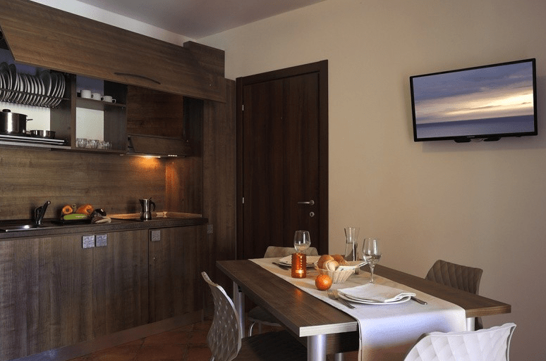 Gli appartamenti sono dotati di cucina con angolo cottura, bagno con doccia e spazio esterno privato. Tutti gli appartamenti della struttura sono dotati di cucina con angolo cottura ad induzione, forno a microonde, TV da 32” con canali satellitari nazionali ed esteri (una in ogni stanza), bagno con doccia con maxi soffione, asciugacapelli, cassaforte e connessione internet (cavo ethernet necessario). Tutti gli appartamenti hanno un affaccio esterno, sia che si tratti di un ampio balcone ai piani superiori, sia di una loggia al piano terra di fronte allo splendido giardino con fiori e piante mediterranei.