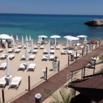A 100 metri si trova la prima di tante spiagge libere di sola sabbia, con acqua degradante e limpidissima, ideale per i bambini. Da 900 metri in poi iniziano le tipiche spiagge lunghe di sabbia, con lidi pubblici e privati.