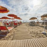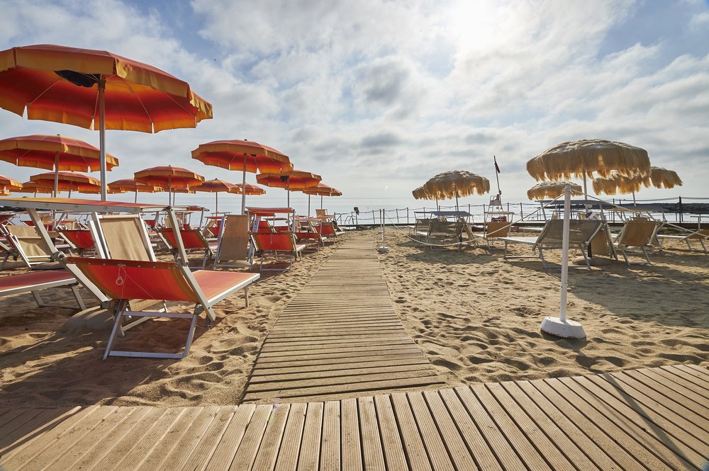 Di sabbia e scogli piatti, con ombrelloni e lettini con passerelle per arrivare al mare. Servizio spiaggia con ombrelloni e lettini incluso nella Tessera Club (ad esaurimento).