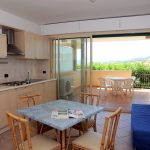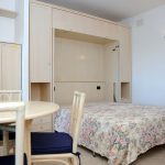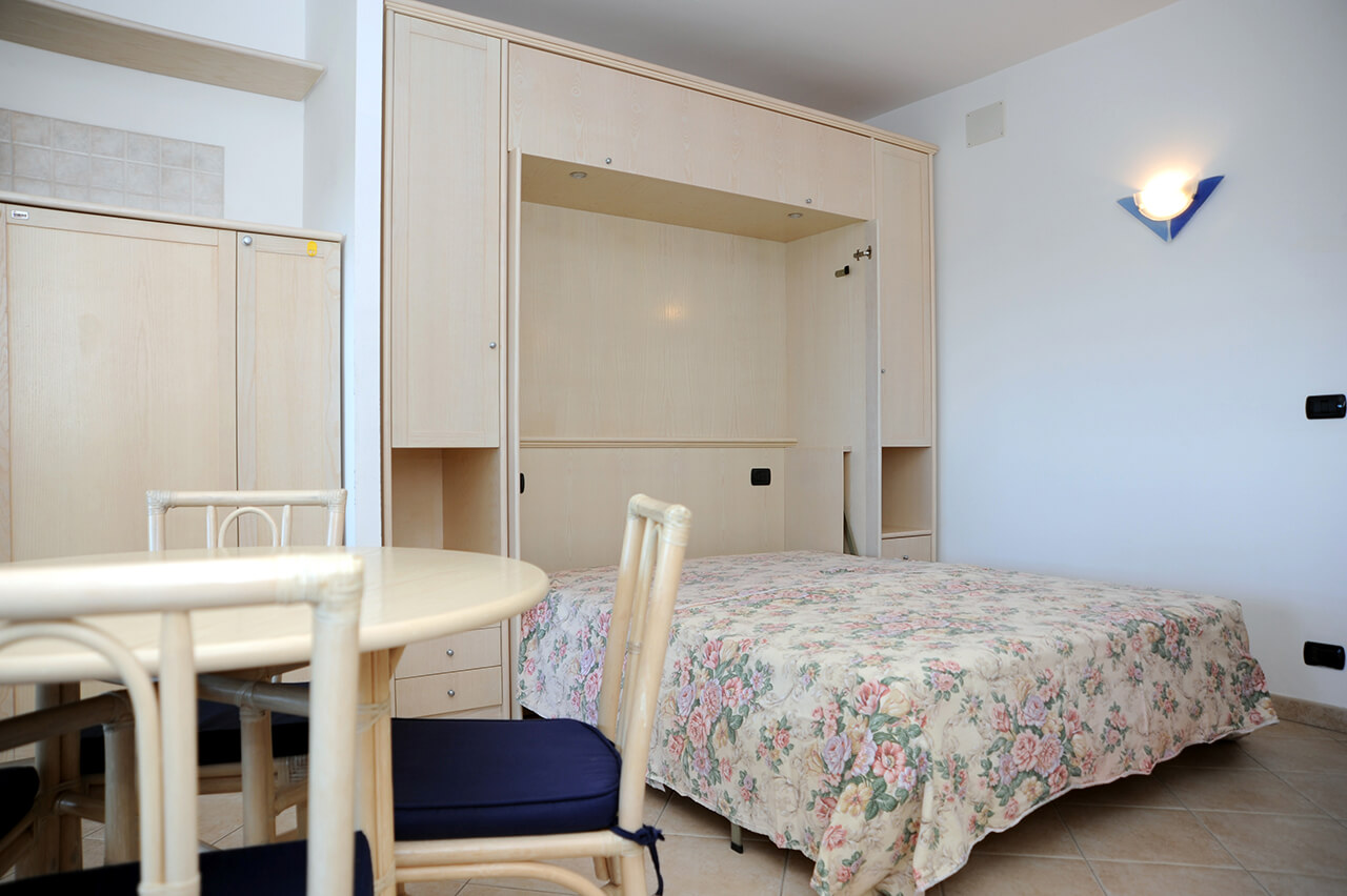 Soggiorno/zona pranzo con angolo cottura (piastre elettriche), divano letto matrimoniale e letto matrimoniale a scomparsa, servizi.