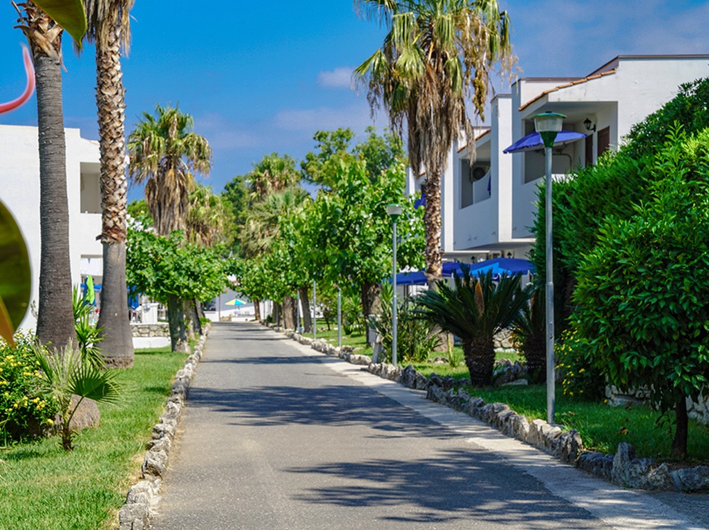 Dal villaggio si può accedere comodamente alla spiaggia di sabbia e ghiaia per godere in tutta tranquillità e relax le vacanze al mare.