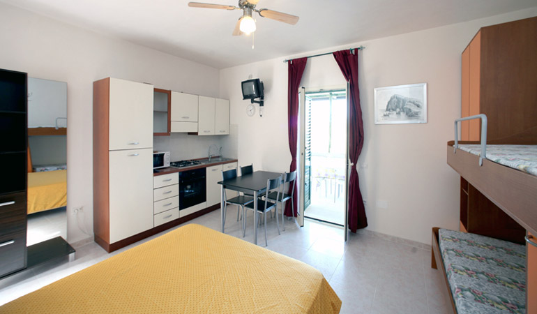 Gli appartamenti sono tutti dotati di ingresso indipendente con spazio esterno attrezzato. A disposizione degli ospiti il servizio spiaggia (facoltativo, a pagamento) presso il Camping Village Baia Falcone (nel lido balneare è presente anche un bar). La spiaggia è molto particolare per la sua conformazione e posizione: si distingue infatti per la lingua di roccia calcarea che segna l'inizio di una lunga spiaggia di sabbia finissima e che si estende per oltre 4 km all'interno della rinomata Baia di Santa Maria di Merino, dalla quale tutta la spiaggia prende il nome. Questo tratto di costa risulta particolarmente indicato per quanti amano gli sport legati all'acqua e al vento e anche per chi vuol vivere delle vacanze al mare a Vieste all'insegna della natura e del benessere.